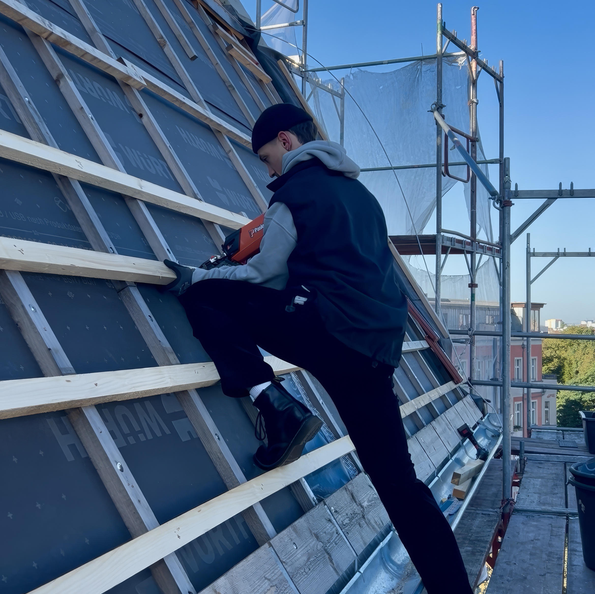 Im ersten Schritt wurde die alte Dacheindeckung vollständig abgetragen. Anschließend haben wir die bestehende Dachkonstruktion gründlich geprüft und wo nötig ausgebessert. Auf die Sparren wurde eine diffusionsoffene Unterspannbahn der Marke Delta Maxx Plus verlegt. Dieses bewährte Produkt zuverlässig vor Feuchtigkeit schützt und gleichzeitig Wasserdampf von innen nach außen entweichen lässt. Darüber folgte die sorgfältige Montage von Konterlattung und Traglattung als Basis für die neue Eindeckung.